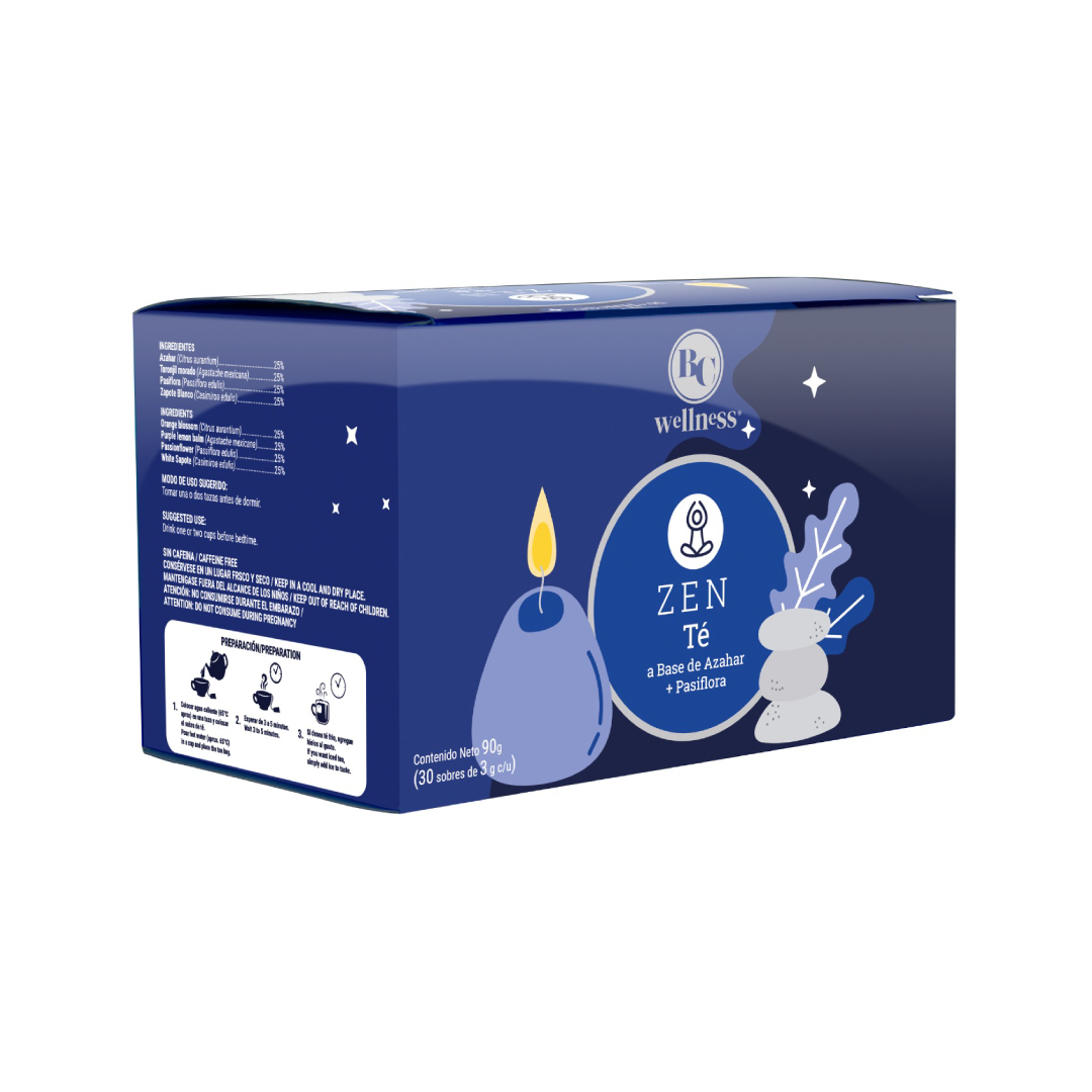 Té elaborado a partir de ingredientes naturales como azhar, toronjil morado, pasiflora y zapote blanco, cuyos usos ancestrales han demostrado ser benéficos para el tratamiento natural de la ansiedad y el insomnio.